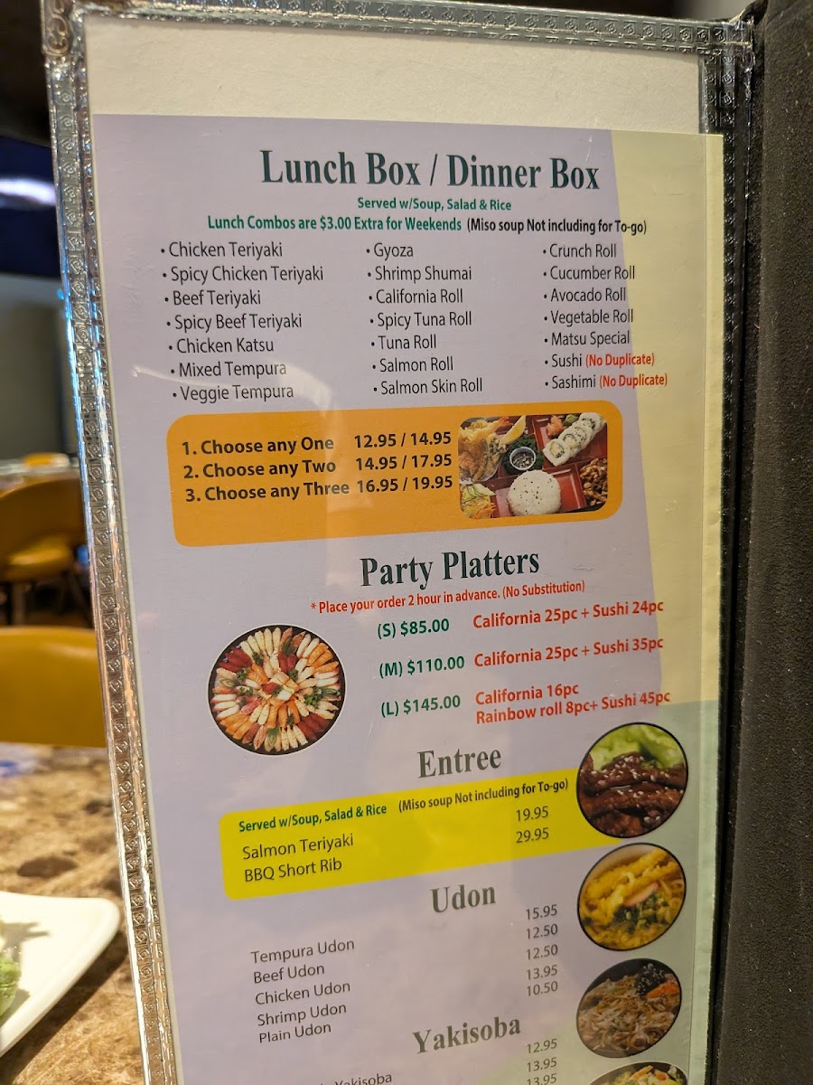 I’ve been going to Matsu for probably about 15 years and it is honestly my favorite sushi restaurant! It has ruined me for other sushi!! The employees are wonderful. The food is consistent. The quality is always top tier. I moved about an hour away from this place and I still dedicate my time to come here whenever I get the chance. If you want good sushi, good people, and a nice time, come to Matsu!